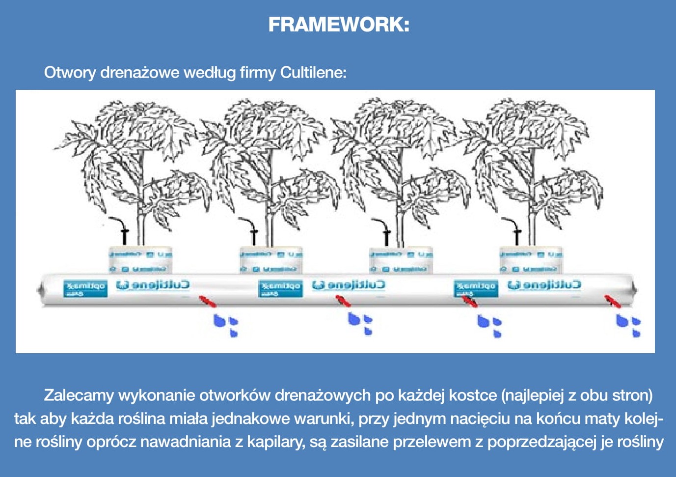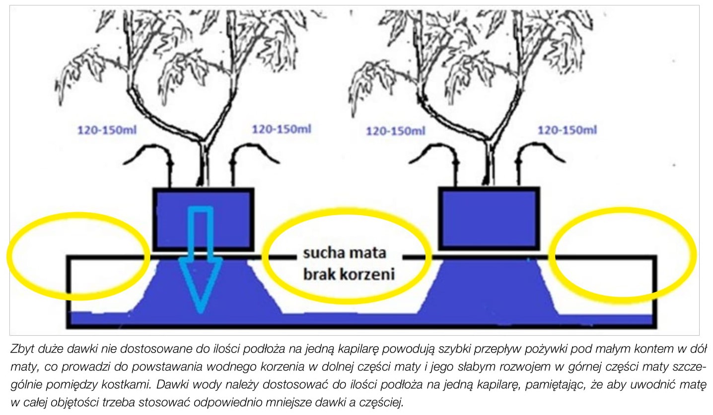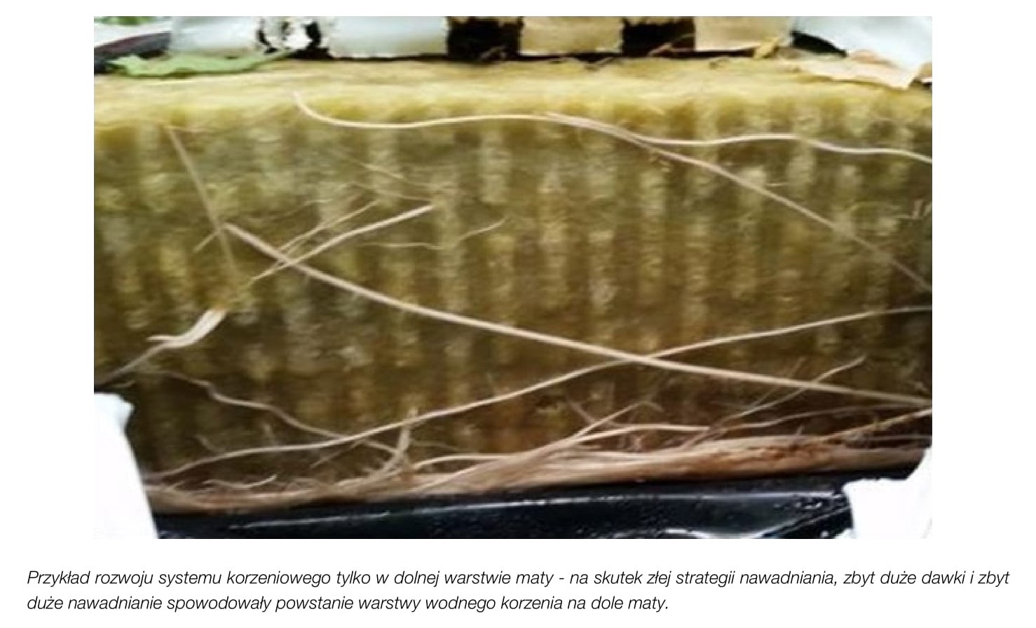Po przerośnięciu maty przez system korzeniowy, teraz musimy zadbać o jego prawidłowy rozwój w całym profilu maty. Po pierwsze, roślina rozwija system korzeniowy, jeśli klimat jest aktywny i następuje intensywna transpiracja oraz pobieranie pożywki, co stymuluje rozwój systemu korzeniowego. Aby jednak korzenie się rozwijały, to w macie muszą panować korzystne warunki. Nawet jeśli klimat w szklarni stymuluje aktywność roślin, to równocześnie musimy prowadzić optymalne nawadnianie, uwzględniające warunki pogodowe. Częstym błędem jest zbyt obfite nawadnianie lub nawadnianie nieodpowiednimi dawkami, przeważnie zbyt dużymi, co sprawia, że korzenie gorzej się rozwijają szczególnie w wierzchniej warstwie.